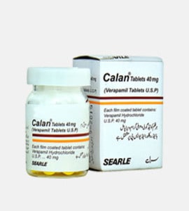 Calan (Verapamil) is a medication that is classified as calcium channel blockers. It helps to cope with high blood pressure, to reduce high blood pressure, helps prevent strokes and treats chest pain (angina). Calan (Verapamil) averts heart attacks, and kidney problems. Under the influence of this medication blood vessels relax giving the chance to blood to flow more easily. Calan (Verapamil) normalizes also the heart rate, improving your feeling and increasing your ability to exercise.